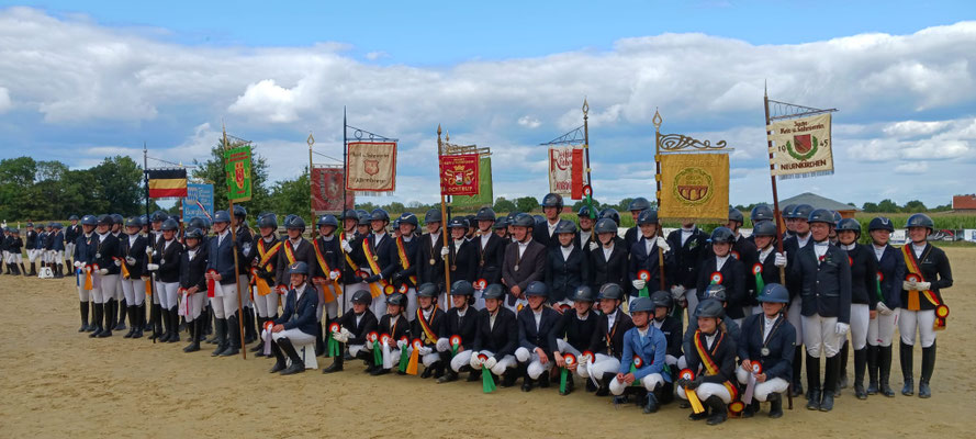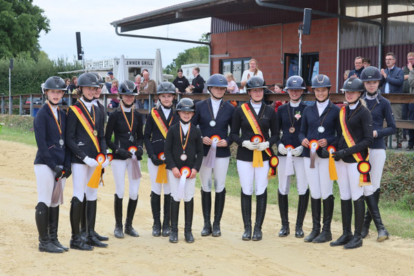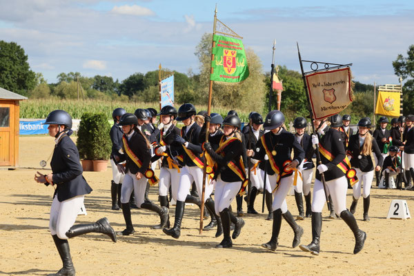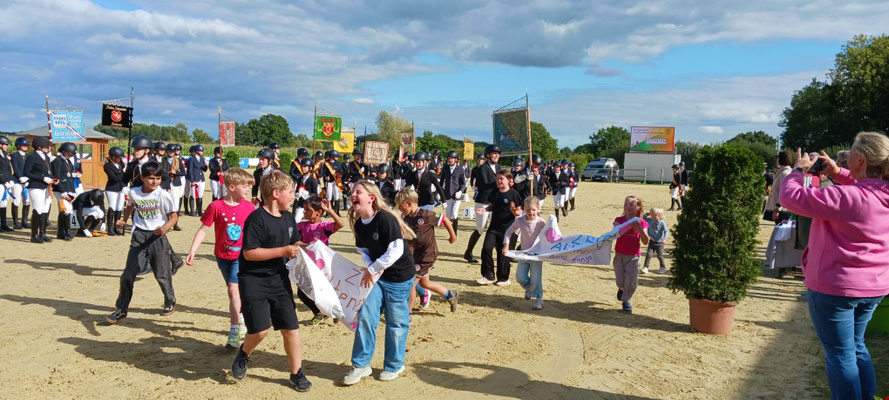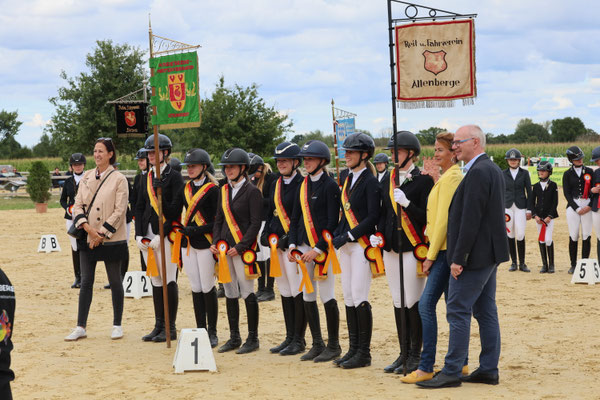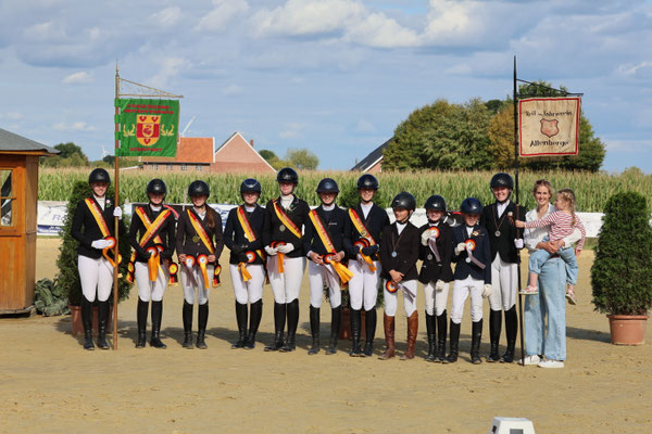 Der Jubel war groß bei den Reiterinnen, Reitern und mitgereisten Fans, als am Sonntagabend feststand, dass der Sieger der Kreisstandarte, der Kreismeisterschaft im Mannschaftsreiten, tatsächlich nach Altenberge ging. Bereits seit Samstagvormittag hatte es danach ausgesehen, als könnten das Altenberger Team unter der Leitung von Mannschaftsführerin Jennifer Moral in diesem Jahr ein gehöriges Wörtchen in der Entscheidung des Mannschaftswettkampfes mitreden. Frank Hoffmann-Kösters, Kira Stratmann und Anneke Meier hatten in der Mannschafts-A-Dressur eine sehr gute Grundlage geschaffen und diese erste von vier Teilprüfungen auf Rang zwei beendet. Auf diese Grundlage konnten die Springreiterinnen Lotta Schulze-Wierling (Cornetino), Ronja Lachnit (Conley) und Vera Schilling (Chaccourage) abends im Mannschafts-A-springen aufbauen. Zwei fehlerfreie Runden genügten, um die Führung zu übernehmen und als „Spitzenreiter“ in den abschließenden Sonntag zu starten. Nun waren wieder die Dressurreiter gefragt, diesmal in einer Dressurprüfung der Klasse L. Erneut lieferten Frank Hoffmann- Kösters und Kira Stratmann mit ihren Pferden ab, man ging folglich auch als Tabellenführer ins abschließende L-Springen. Janina Dües im Sattel von Coronelly und Gerrit Holz mit Käptn übernahmen die Verantwortung und konnten den berühmten Sack schließlich zumachen. Eine Nullrunde genügte, so dass sich das Altenberger Team in der Siegerehrung ganz oben auf dem Podest feiern lassen durfte.