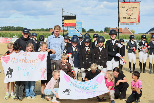 Die Altenberger Vereinsjugend präsentierte sich beim Reitturnier in Borghorst in bärenstarker Verfassung. Julius Schlömer konnte an diesem Wochenende gleich vier goldene Schleifen mit nach Hause nehmen. Im Sattel von Belissima siegte er sowohl im Springreiter Wettbewerb als auch im Caprilli Test. Mit seinem Pony Little Things konnte er einen Stilspring Wettbewerb und einen Standard Spring Wettbewerb gewinnen. Mit Belissima platzierte er sich zusätzlich noch auf den Plätzen drei und vier in unterschiedlichen Dressurwettbewerben. Seine Schwester Lea Schlömer und ihr Pony Figo freuten sich über drei Platzierungen im Capelli Test, im Geschicklichkeitswettbewerb und im Reiterwettbewerb. Sophie Wilmer hatte ebenfalls Little Things gesattelt und die Glückwünsche für Rang zwei im Reiterwettbewerb entgegen. Sören Rostin hatte sein Pony La Luna mit nach Borghorst gebracht und nahm drei Platzierungen in Empfang. Im Standardspringwettbewerb landeten die beiden auf Rang sechs, im Caprillitest und im Springreiter Wettbewerb jeweils auf Rang drei.